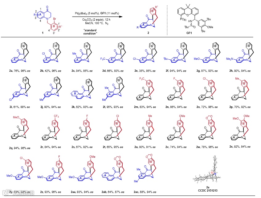 有了最佳的反应条件在手,于是对N-苄基取代的二氢喹啉酮衍生物1的底物范围进行了研究。多种带有不同R/R1基团的N-苄基取代的二氢喹啉酮衍生物1可以有效地进行分子内芳基化反应,生成结构多样的含有氮手性的八元氮桥[3.3.1]环状产物2,其产率为中等至良好,且具有较高的对映选择性(35%~95%,85%~96% ee)。具体来说,我们研究了A和B的芳环上的一系列取代基,无论是吸电子还是给电子的取代基都可以很好地兼容。在底物拓展过程中发现苯环上的立体位阻对反应很敏感。因此,底物中4,1'-或4'-位存在取代基时,结果不太理想。