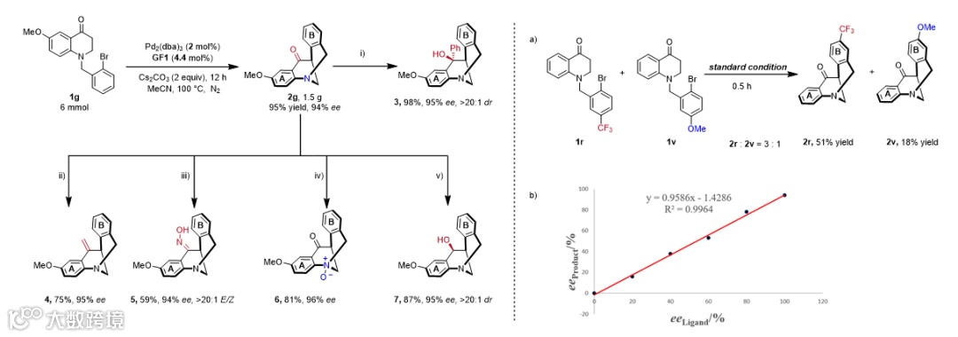 图3. 克级规模反应、产物衍生化、竞争性实验与非线性效应