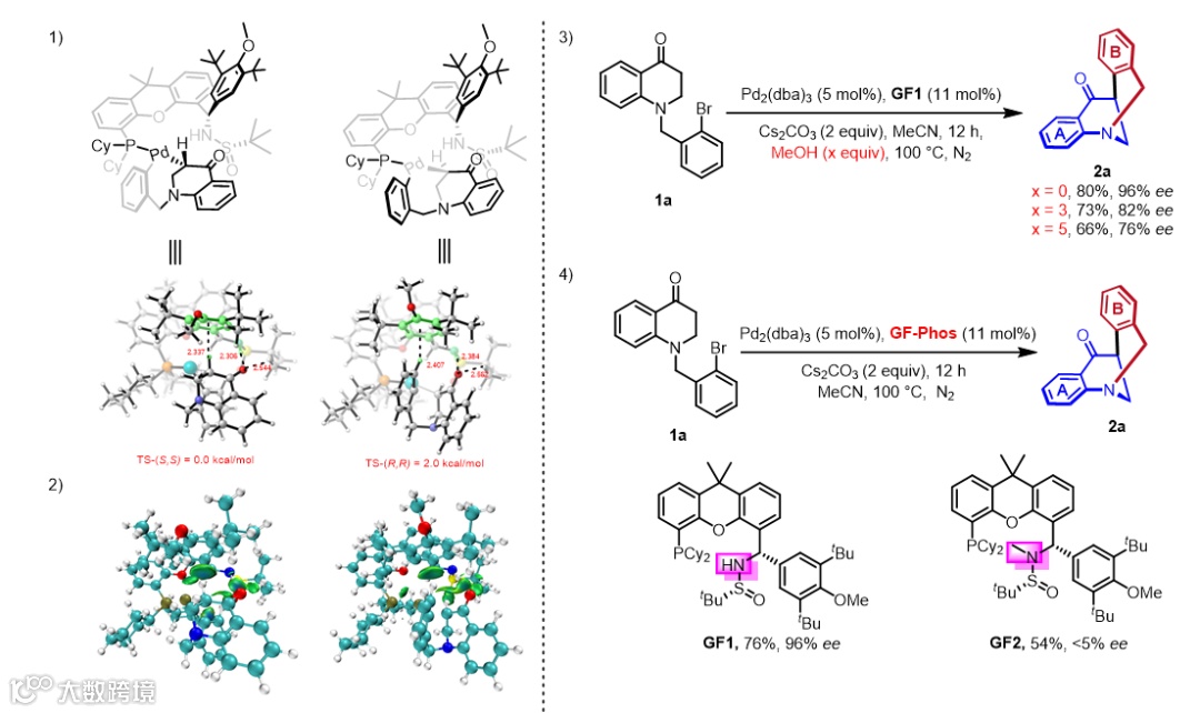 为了阐明配体在控制对映选择性方面的作用,还对C-C还原消除进行了DFT计算。计算结果显示,两个过渡态的活化能相差2.0 kcal/mol,有利于(S,S)-构型产物的生成,这与实验结果一致。对计算出的还原消除过渡态结构的进一步研究表明,底物片段的羰基中的氧原子与配体中的NH基团之间存在NH···O氢键。除了氢键,通过独立梯度模型(IGM)也观察到底物C-H与配体芳环之间的弱相互作用,在上述底物C-H键和芳环片段之间显示出蓝绿色的等值面,表明有吸引力的相互作用。为了进一步验证DFT计算的结果,进行了一些简单的控制实验。当在反应中加入3当量的甲醇时(已知甲醇会干扰氢键),所得产物的对映选择性则会发生下降(96%~82% ee),而当加入5当量的甲醇时,产物的对映选择性则会进一步发生下降(96%~76% ee)。其次,当使用甲基掩盖配体上的氮原子时,观察到产物的对映选择性发生急剧的下降(96%~<5% ee)。这些实验说明配体与底物之间的氢键在控制对映选择性中起到了关键作用。