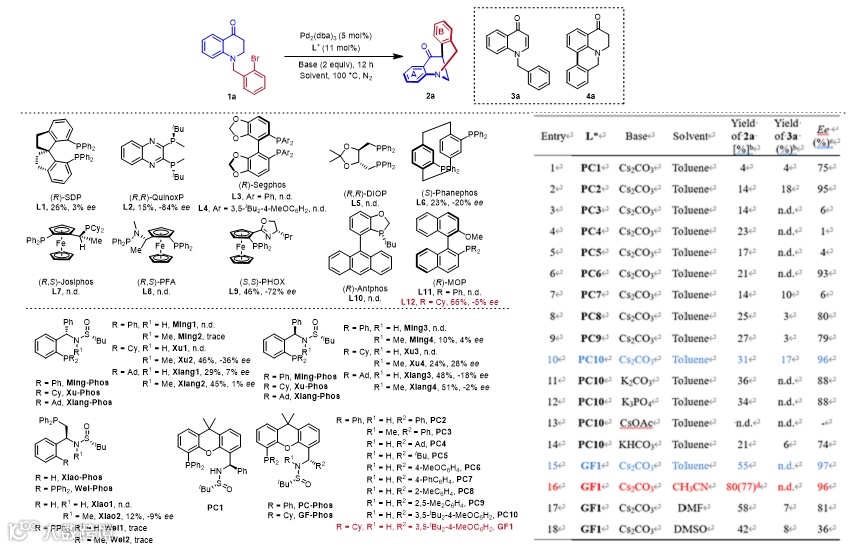 首先,对市售的商业化配体(如双齿膦配体、氮磷配体以及单齿膦配体)进行考察。大多数商业配体(L1,L3-L8,L10-L11)未能促进这一反应的发生。尽管(R,R)-QuinoxP(L2)和(S,S)-PHOX(L9)可以达到中等至良好的对映选择性,但反应性很差。相反(R)-MOP(L12)能很好地促进反应,但对映选择性几乎没有。这些结果表明,配体的选择对于反应的活性和选择性至关重要。最近,张俊良课题组开发的Sadphos在金属催化的偶联反应中表现出优异的性能,于是接下来研究了Sadphos在该反应中的表现。在Sadphos的基本版本中,只有PC-Phos(PC1,PC2)在对映选择性控制方面取得了优异的结果,尽管收率很低。值得注意的是,如果PC2的氮上用甲基保护(PC3),对映选择性就会急剧下降。考虑到这一结果,随后对不同的R2基团(PC4-PC10)进行了研究,只有PC10作为配体时,该反应以31%的产率和96% ee获得目标产物。在大多数情况下,检测到副产物3a,这可能是在还原消除之前的β-氢消除或氧化加成之后的发生HAT产生的。当使用CsOAc时,检测到大量的副产物4a,它是通过相邻的sp2 C-H芳基化产生。这时想到,在筛选(R)-MOP配体的过程中,用更富电子的二环己基膦代替二苯基膦可以提升产率。鉴于这一结果,于是尝试了更富电子的GF-Phos,正如预期的一样,获得了更好的结果。通过微调其他条件,如溶剂、反应温度和催化剂负载量等,可以进一步提高产率。最后,在最佳的反应条件下,以良好的产率(80%)和高对映选择性(96% ee)得到了目标产物2a。