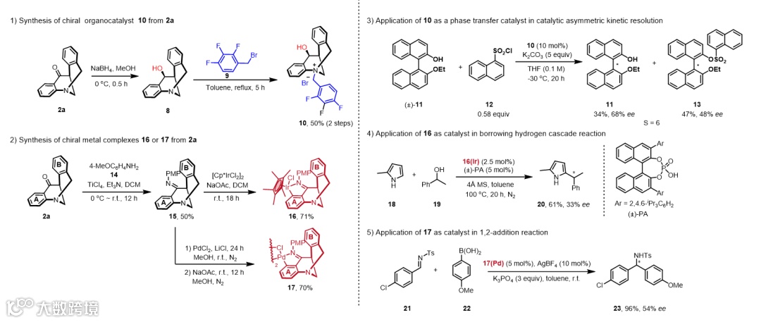为了进一步说明产物的有用性,将产物转化成手性有机催化剂和手性金属金属络合物,将产物简单转化便可合成手性季铵盐和手性金属铱和钯络合物,利用季铵盐作为相转移催化剂,实现乙氧基保护的联萘酚的催化动力学拆分,利用手性金属铱络合物催化实现2-甲基吡咯与消旋二级醇的借氢串联反应,利用手性金属钯络合物催化实现硼酸了对亚胺的1,2-加成反应,尽管结果不是很理想,但这足以说明这些催化剂在催化不对称转化中展示出的巨大潜力。