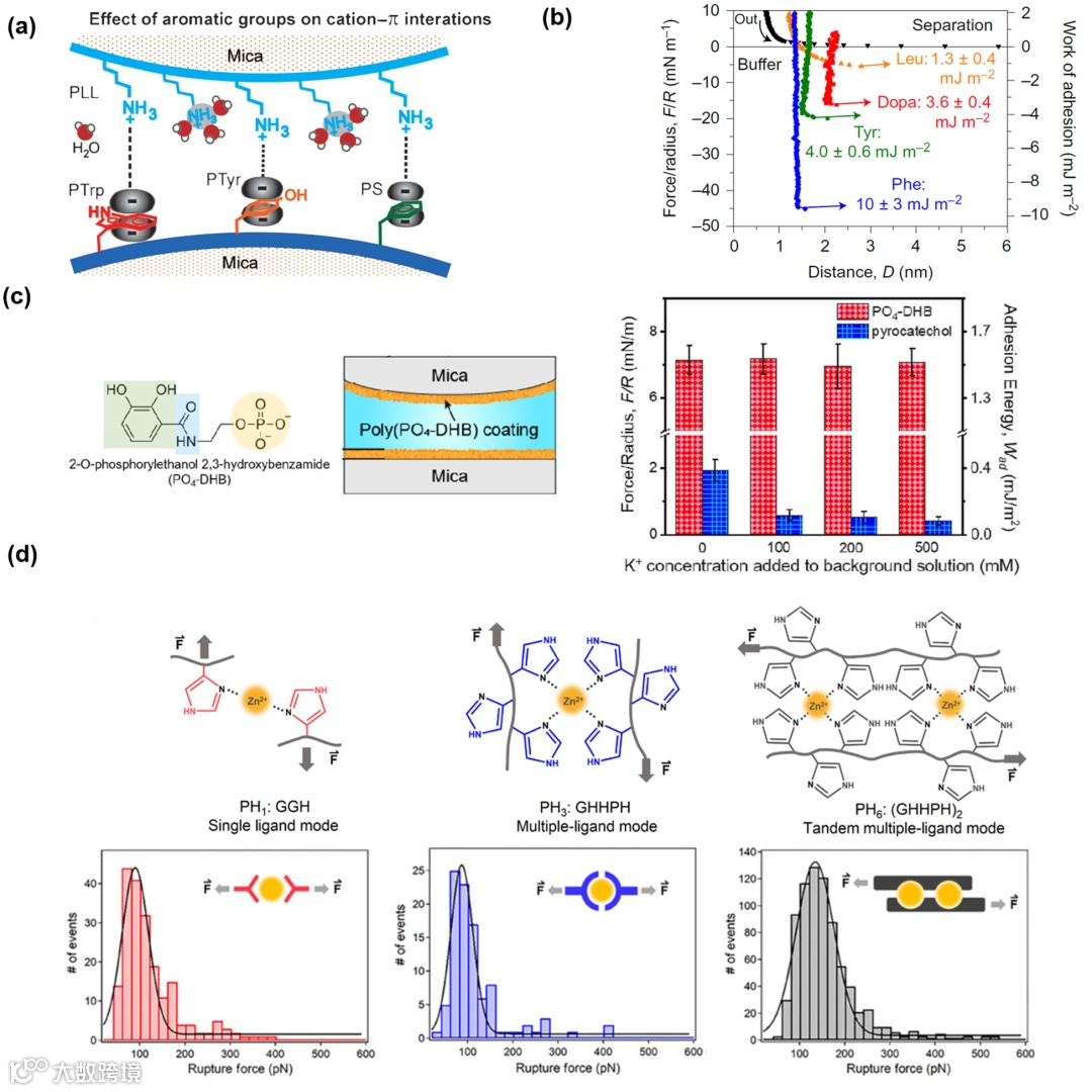 图2. 贻贝启发的阳离子-π、阴离子-π阳离子和组氨酸-金属配位作用。