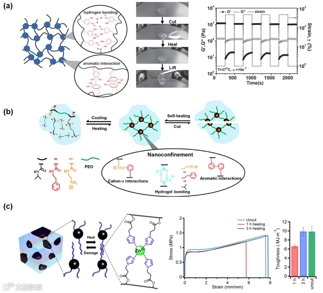 将这些受贻贝启发的非共价作用引入聚合物体系,我们可以获得一系列具有自修复性能的功能高分子材料。通常,功能基团的引入有三种途径:合成带有功能基团的高分子链;原位合成聚多巴胺(PDA)纳米颗粒;直接加入多酚类化合物,如单宁酸等。通过调控引入基团的种类,方式,数量和环境因素,聚合物中的非共价作用力可以被精确地控制,从而表现出理想的机械性能和自修复能力。