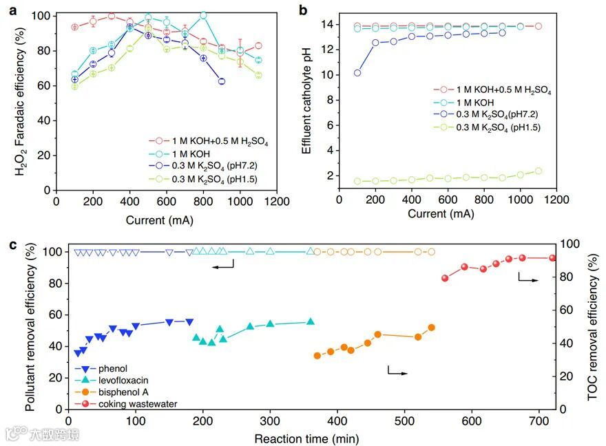 Figure 2. Acidic electrosynthesis H2O2 performance and Fenton applications.a-bH2O2 electrosynthesis employing 1 M KOH+0.5 M H2SO4, 1 M KOH+1 M KOH, 0.3 M K2SO4+0.3 M K2SO4 (pH 7.2 or 1.5) as catholyte and anolyte in the bigger flow-cell electrolyzer (test conditions: cathodic working area of 4 cm-2, catholyte and anolyte flow rates of 82–100 mL h-1). c Pollutant removal and TOC removal efficiency by the flow-cell Fenton system. (Test conditions: 500 mA current, effluent H2O2 rate of 72 mL h-1; synthetic wastewater: 10 mg L-1 phenol, bisphenol A or levofloxacin and 1 mM Fe2+, flow rate of 700 mL h-1; real coking wastewater: initial TOC of 44.1 mg L-1, 5 mM Fe2+ dosage, flow rate of 140 mL h-1.)