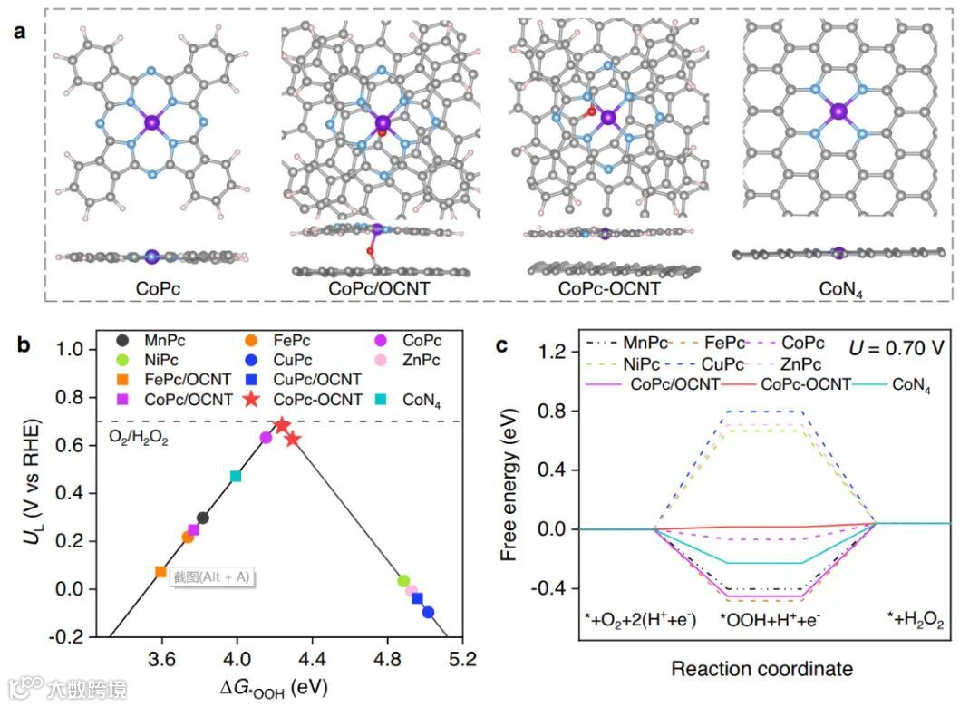 Figure 1. Theoretical calculations for two-electron ORR.a, Atomic structures of CoPc, CoPc/OCNT, CoPc-OCNT and CoN4 models. b Calculated activity-volcano curve for two-electron ORR. c Free-energy diagrams for two-electron ORR pathway at 0.7 V vs RHE, where * and *OOH denote an unoccupied active site and adsorbed *OOH, respectively.