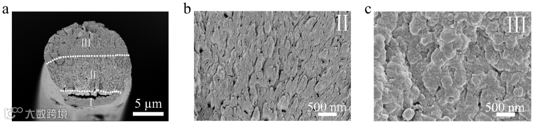 图2.带缺口柞蚕丝的断面形貌。(I )缺口区;(II)锥状形貌区;(III)蘑菇头状形貌区