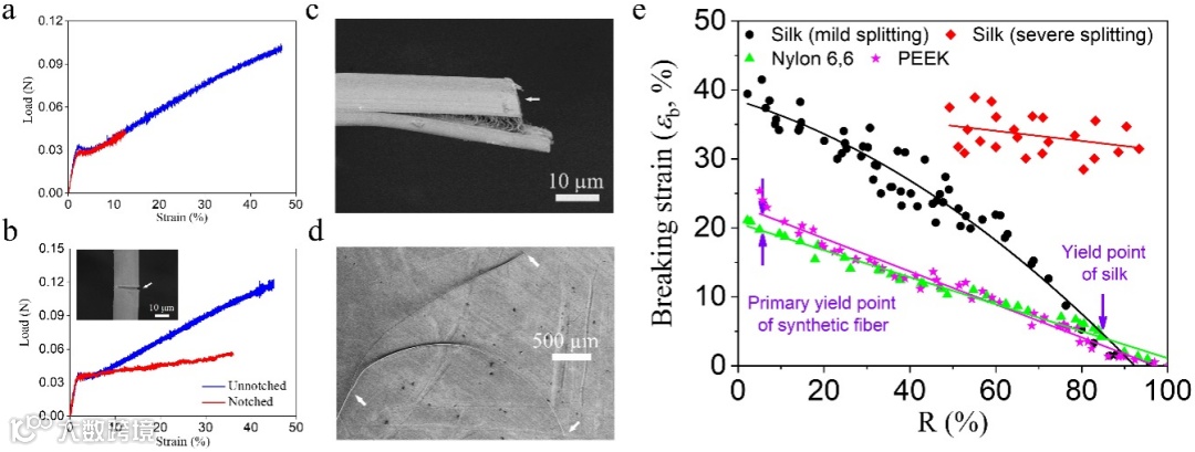 有趣的是,缺口柞蚕丝表现出两种典型的拉伸失效行为,即伴有轻微劈裂的缺口断裂和先明显劈裂后再断裂(图3a-d)。轻微劈裂失效的缺口柞蚕丝,随着缺口深度增加,断裂伸长率降低。而明显劈裂为主失效的缺口柞蚕丝,其缺口深度R均>50%,尽管大缺口显著降低了柞蚕丝的最大载荷,但断裂伸长率却几乎保持了与原丝相同的水平。文章对比研究了以高取向尼龙66和聚醚醚酮(PEEK)为代表的合成高分子纤维的缺口断裂行为,发现随着缺口深度的增加,缺口纤维的断裂伸长率呈现出持续下降的趋势,但所有的样品却均未出现先劈裂后断裂的模式(图3e)。