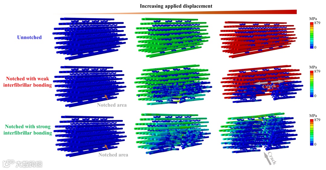 为了解释柞蚕丝中纳米纤维结构同劈裂行为的特定联系,我们构建了由49根纤维元组成的柞蚕丝纤维结构模型,并将并排纳米纤维之间的连接强度作为关键变量,复现了缺口柞蚕丝的两种典型失效行为。当纳米纤维之间连接强度极高时,由横向偏转至轴向的裂纹尖端应力水平不足以破坏纳米纤维的连接,无法引发劈裂,这一情况对应于浅缺口小劈裂的情况;当纳米纤维之间连接强度适中或较小时,裂纹偏转后,裂纹尖端的应力水平将破坏纳米纤维的连接,致使大劈裂行为的发生,而其时未被切断的纤维部分能够完整地承受载荷(即缺口部分被“剥离”),像一根未被损伤的纤维一样完成弹塑性形变到断裂的过程。