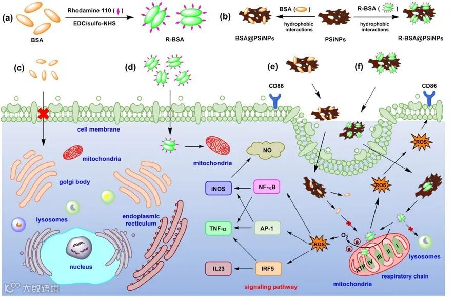 本文要点在于:(1)研究发现R-BSA具有线粒体靶向能力,通过干扰巨噬细胞线粒体的呼吸链,诱导其电子外泄,进而产生线粒体活性氧自由基(mitoROS)。随着mitoROS扩散到细胞胞浆内,可以进一步激活IRF5、NF-κB和AP-1等信号转导通路,并诱导IL-23、TNF-α 等促炎细胞因子等释放;(2)利用PSiNPs纳米载体递送R-BSA,可进一步提高原始巨噬细胞产生线粒体ROS,并相应的强化其在体外或体内向M1型转变,伴随产生大量炎症介质。(3)考虑到PSiNPs和BSA等自身良好生物安全性、易于表面修饰、以及优异药物递送等功能,相信这些基础性研究结果不仅丰富了纳米材料调控固有免疫细胞的机理体系,同时也显示白蛋白@多孔硅纳米系统在抗肿瘤、抗病毒和抗菌等免疫治疗中具有潜在应用价值。
