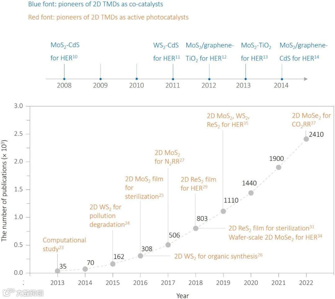 图2. 用于光催化的2D TMDs的代表性研究工作和年度出版物数量。