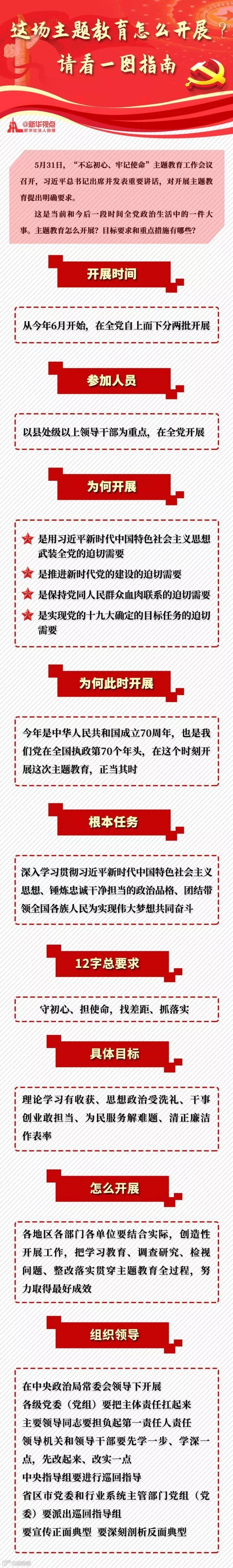 5月31日,“不忘初心、牢记使命”主题教育工作会议在北京召开。这是当前和今后一段时间全党政治生活中的一件大事。主题教育怎么开展?目标要求和重点措施有哪些?请看一图指南。