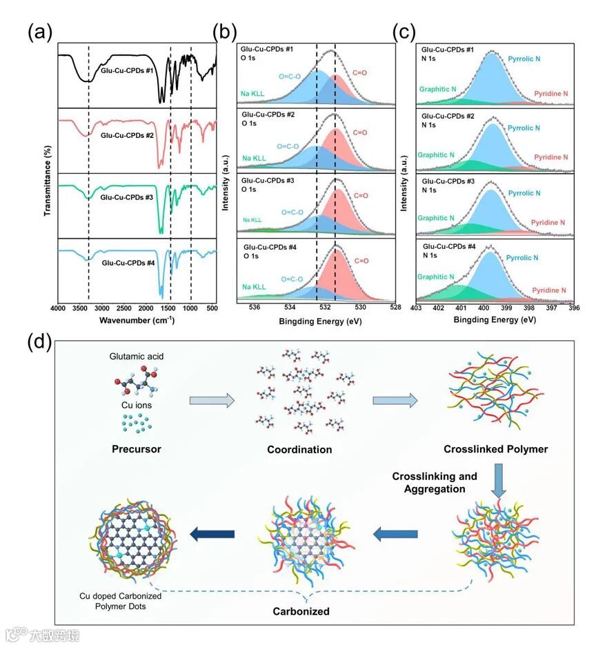 图2. Cu掺杂对CPDs表面活性基团的影响以及TMAs-doped-CPDs的形成机制示意图