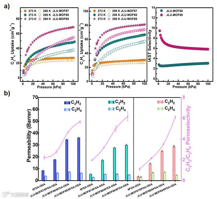 图2. a)JLU-MOF87-89的气体吸附与分离性能,b)JLU-MOFs基膜对