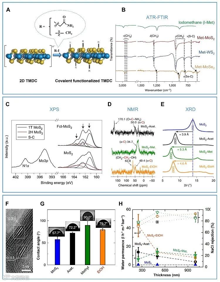 5) TMDCs表层硫属原子易功能化,可扩大层间距,进一步提高水分子传输。