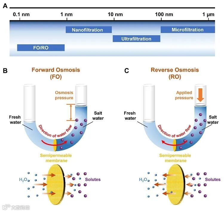 图3. 膜技术的分类(A)和基本原理:(B)正渗透技术;(C)反渗透技术。