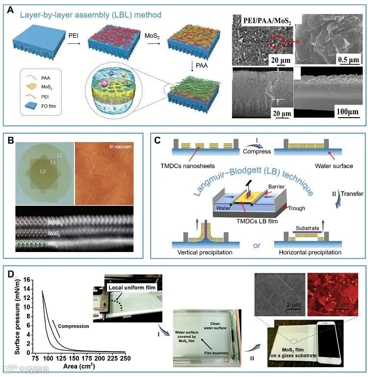 2)TMDCs膜的制备方法包括:抽滤法、层层自组装(LBL)法、Langmuir-Blodgett沉积法、浇铸法和旋涂法。