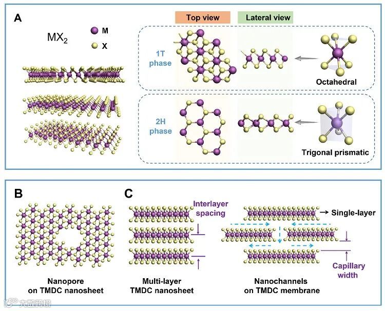 治结构。单层TMDCs层层堆叠通过范德华力连接形成块体,包含了八面体金属1T相和三棱柱半导体2H相。TMDCs作为膜材料的优势如下: