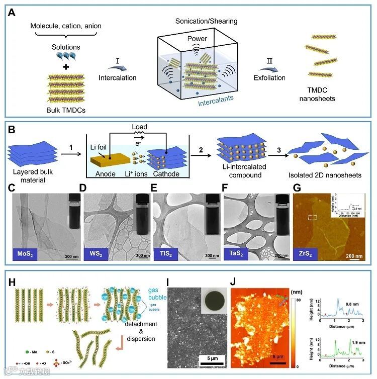 图4. TMDCs纳米片自上而下的合成方法:液相剥离法的示意图,TMDCs产物TEM图、光学显微图、SEM图及AFM图。
