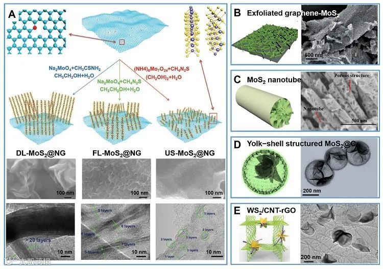 (c)水热法和溶剂热法。如图5,研究人员通过加入各种模板剂,可制备不同形貌结构的TMDCs纳米材料(如Mo