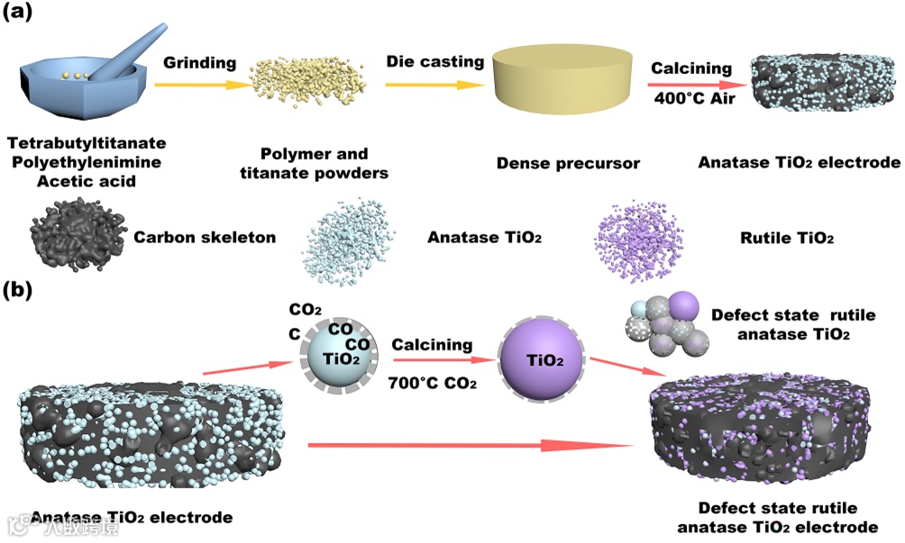中国科学院过程工程研究所王宝研究员团队通过设计新的全电化学活性自支撑一体化厚电极(~ 500 μm),通过在厚电极中引入含氧空位缺陷的金红石/锐钛矿TiO2(D-R-A-TiO2)异质结和碳的双连续集骨架,提高低温条件下荷质传导能力和维持电极结构稳定性,电极内部空腔有利于电解液的浸润和锂离子的传输,缓解电极内应力,增强有效的电子、离子传输,这为高比能低温锂离子电池的开发提供了新思路。团队首次利用CO2气氛退火处理锐钛矿型TiO2和高分子衍生碳复合电极的前驱体,将部分TiO2从锐钛矿相转化为金红石相,同时刻蚀除去部分碳,制备含氧空位缺陷的金红石/锐钛矿TiO2异质结和碳双连续骨架自支撑的全电化学活性厚电极。含氧空位缺陷的金红石/锐钛矿TiO2异质结包含II型交错能带排列,可以诱导电子高度局域化,降低离子的迁移势垒。厚电极中多孔结构有利于电解液的浸润,可以储存部分电解液,低温下可促进锂离子的扩散,缓解电极内应力。双连续的金红石/锐钛矿TiO2异质结和碳骨架形成协同优势的导电网络,使厚电极表现出优异的储锂性能。
