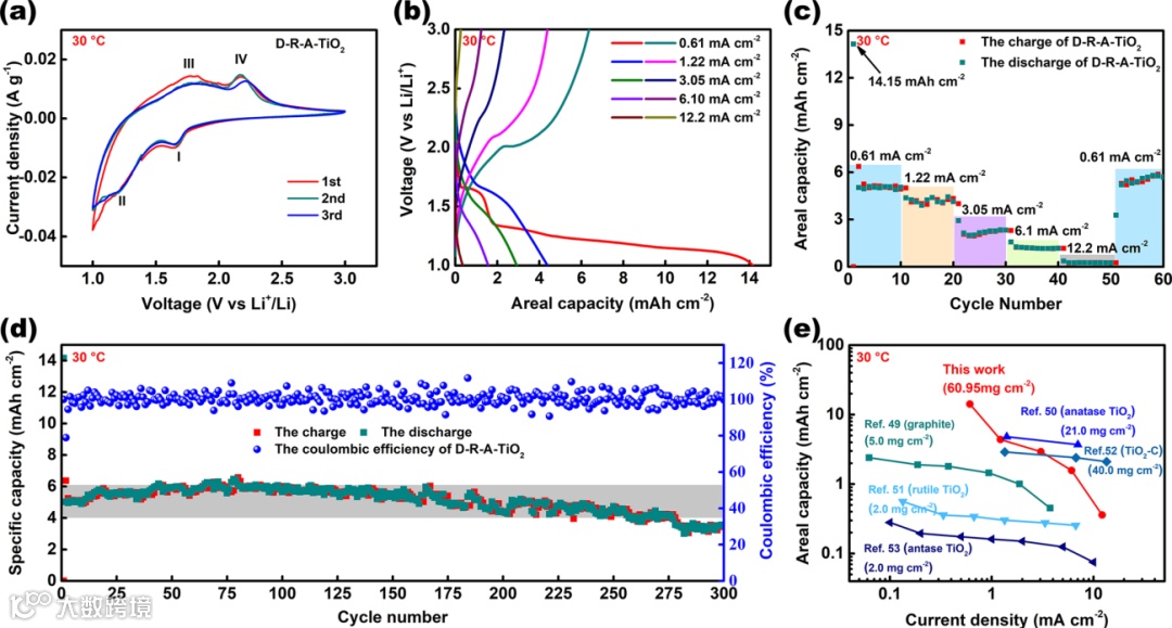 图4.在30°C下,D-R-A-TiO2电极作为锂离子电池负极的电化学性能。