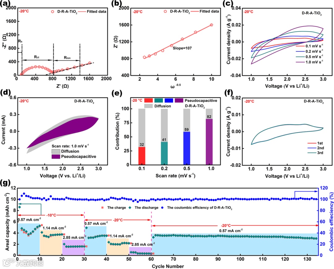 图5.在-20°C下,D-R-A-TiO2电极作为锂离子电池负极的电化学性能。