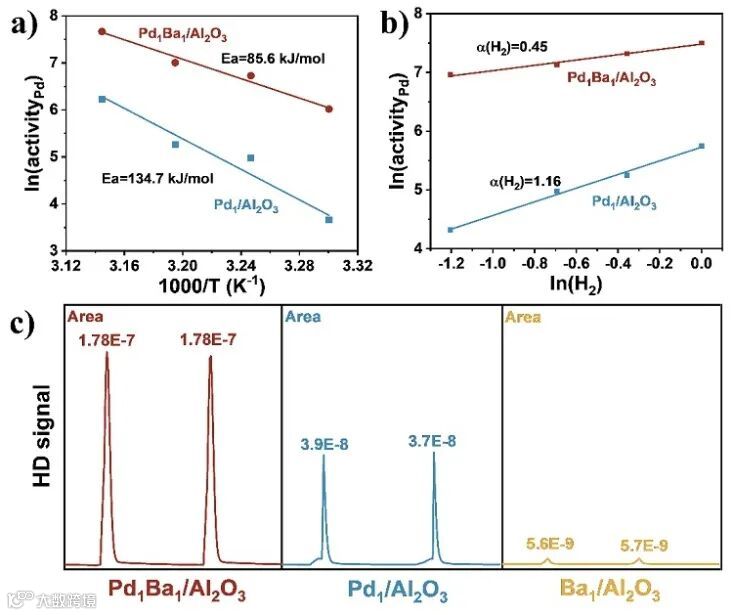 Figure 4. a) The experimental Arrhenius plots and b) H2 reaction orders of Pd1Ba1/Al2O3 and Pd1/Al2O3. c) H2-D2 exchange experiments over Pd1Ba1/Al2O3, Pd1/Al2O3, and Ba1/Al2O3. 原文(扫描或长按二维码,识别后直达原文页面):Enhanced Hydrogenation Properties of Pd Single Atom Catalysts with Atomically Dispersed Ba Sites as Electronic PromotersYing Zhang, Yujie Cheng, Xilun Wang, Qingdi Sun, Xiaohui He, Hongbing JiACS Catal., 2022, 12, 15091−15096. DOI: 10.1021/acscatal.2c04626 点击“阅读原文”,查看 化学 • 材料 领域所有收录期刊