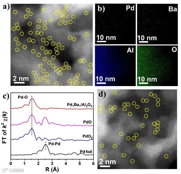 Figure 1. a) AC HAADF-STEM images, b) Elemental analysis mapping images, and c) Pd extended X-ray absorption fine structure (EXAFS) spectra of Pd1Ba1/Al2O3. d) AC HAADF-STEM image of Pd1/Al2O3.