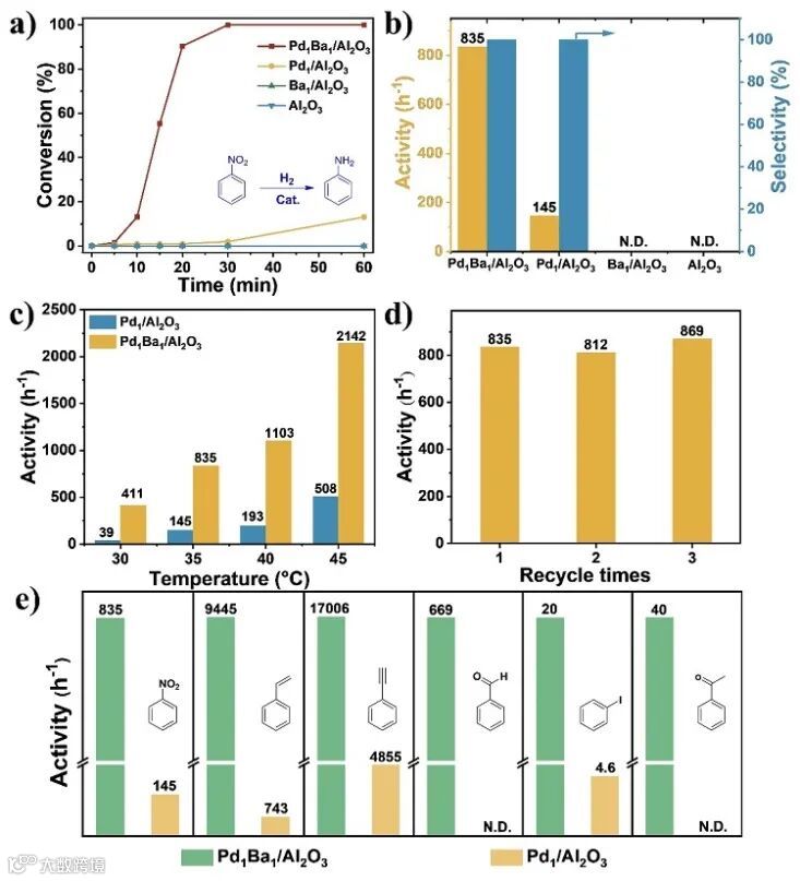 Figure 3. a) Time dependences of nitrobenzene conversion and b) Comparation of activity and selectivity over Pd1Ba1/Al2O3, Pd1/Al2O3, Ba1/Al2O3, and Al2O3. c) The activity under 30 °C, 35 °C, 40 °C and 45 °C, respectively. d) Stability test on Pd1Ba1/Al2O3 in 3 cycles. e) Comparison of the catalytic activities for the hydrogenation of different substrates over Pd1Ba1/Al2O3 and Pd1/Al2O3. Reaction conditions: 3 mL ethanol, 0.2 mmol substrates, 0.125 mmol tridecane as internal standard, 0.5 MPa H2, T=35 °C. Note, 55 °C for acetophenone.