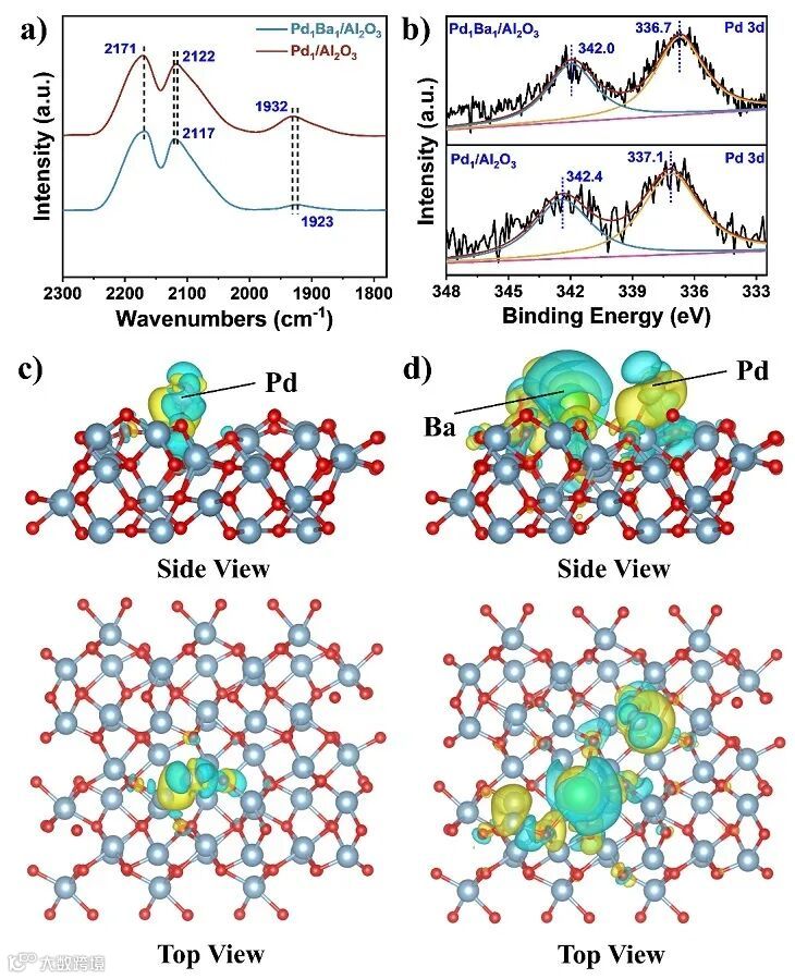 Figure 2. a) DRIFT spectra of CO adsorption and b) XPS spectra of Pd 3d over Pd1Ba1/Al2O3 and Pd1/Al2O3. Differential charge density on c) Pd1/Al2O3 and d) Pd1Ba1/Al2O3 surface (the colors yellow and cyan represent the increase and decrease of charge density), respectively.