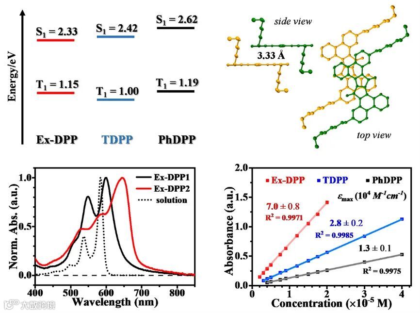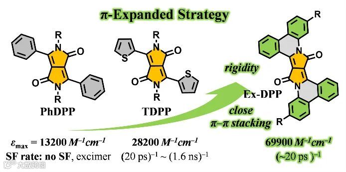 教授合作,全面解析了Ex-DPP分子的稳态瞬态光物理性质,构筑了一类具有高消光系数、适合三线态能级、高效稳定的实用性激子裂分材料体系,并提出了π共轭拓展激子裂分材料策略(图1)。