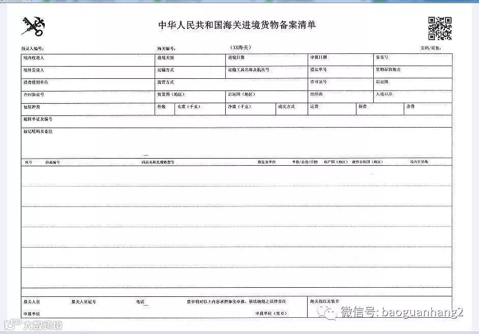 五、进境货物备案清单增加12项:“页码/页数”、“境外发货人”、“合同协议号”、“包装种类”、“货物存放地点”、“启运港”、“经停港”、“入境口岸”、“最终目的国(地区)”、“报关人员证号”、“电话”、“自报自缴”(在表体商品项下方打印);修改4项:原“收发货人”修改为“境内收货人”、原“进境口岸”修改为“进境关别”、原“运输工具名称”修改为“运输工具名称/航次号”、原“随附单证”修改为“随附单证及编号”;删除2项:“录入员”、“录入单位”; 位置变化3项:“集装箱号”、“境内目的地”、“申报单位”。
