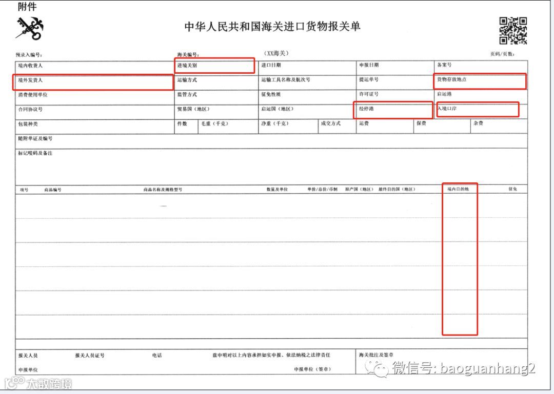 三、进口货物报关单增加9项:“页码/页数”、“境外发货人”、“货物存放地点”、“启运港”、“入境口岸”、“最终目的国(地区)”、“报关人员证号”、“电话”、“自报自缴”(在表体商品项下方打印);修改5项:原“收发货人”修改为“境内收货人”、原“进口口岸”修改为“进境关别”、原“运输工具名称”修改为“运输工具名称及航次号”、原“装货港”修改为“经停港”、原“随附单证”修改为“随附单证及编号”;删除2项:“录入员”、“录入单位”;位置变化3项:“集装箱号”、“境内目的地”、“申报单位”。