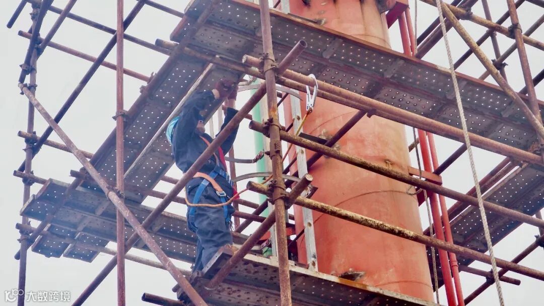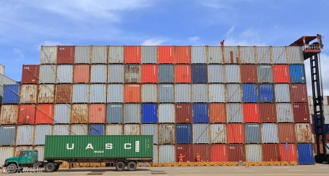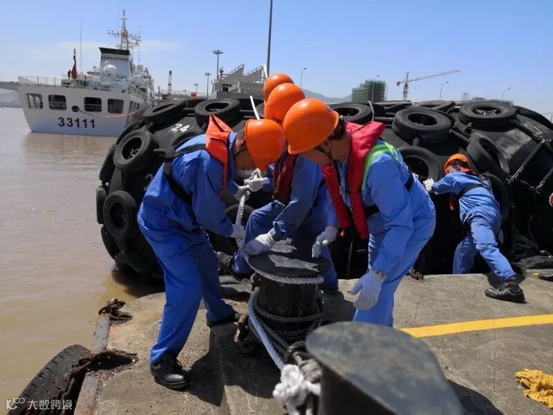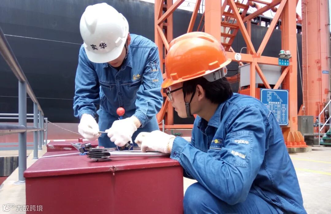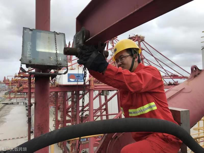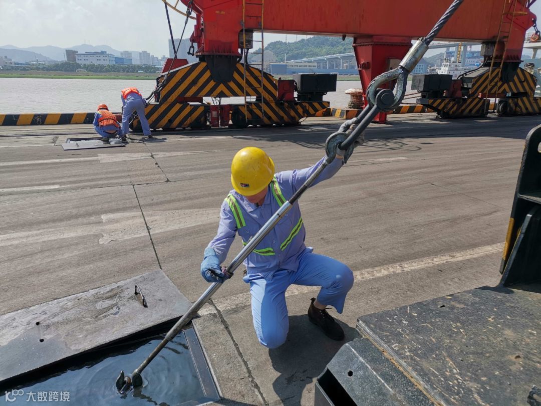 码头工人使用捆扎带绑扎固定空箱,防止集装箱被吹落或移位
