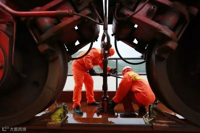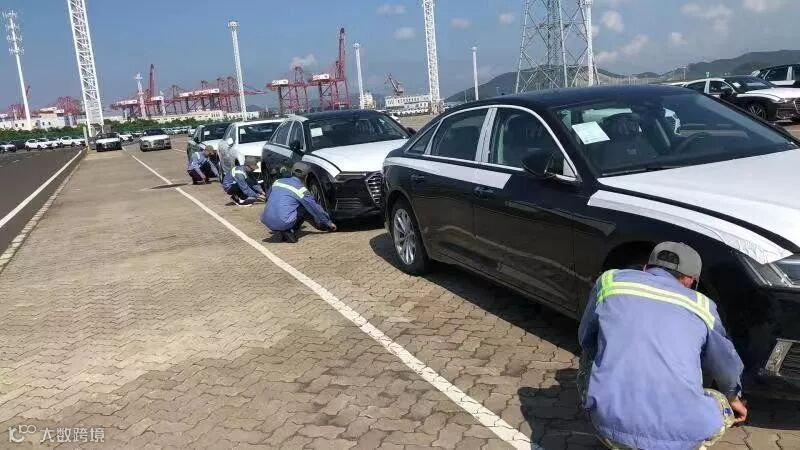 滚装码头商品车司机对露天停放的商品车进行木塞加固