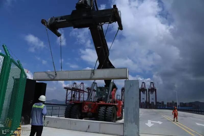 场地督导员正指挥正面吊进行防洪闸板吊装