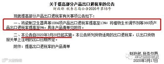 3月17日,国家财政部、税务总局联合发布公告,将瓷制卫生器具等1084项产品出口退税率提高至13%;将植物生长调节剂等380项产品出口退税率提高至9%。。本公告自2020年3月20日起实施。本公告所列货物适用的出口退税率,以出口货物报关单上注明的出口日期界定。