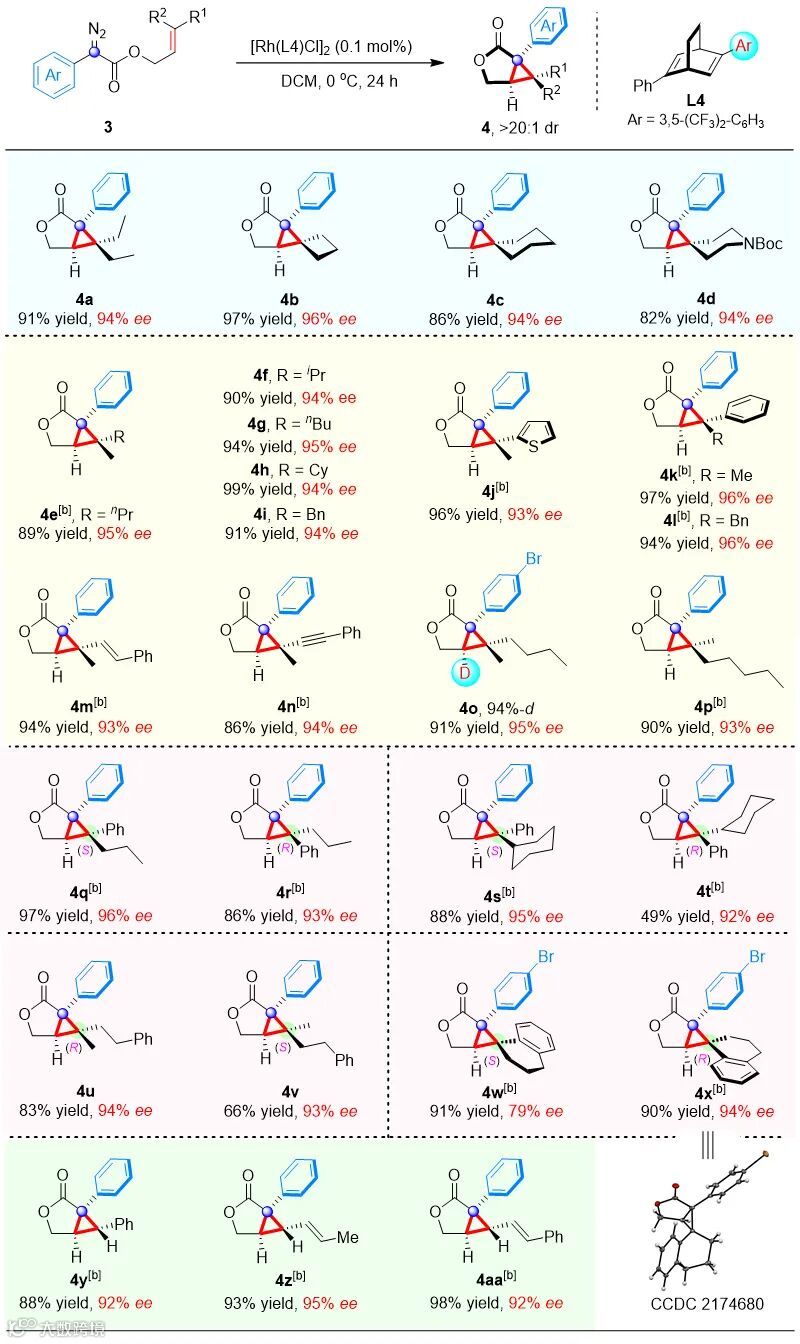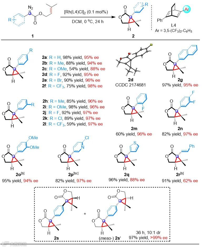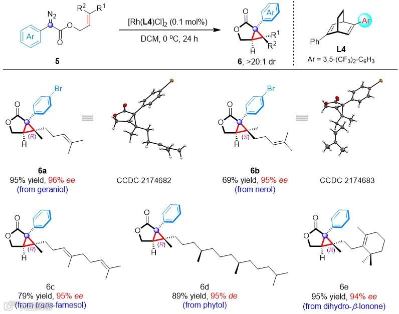 将铑(I)/手性双烯催化体系进一步拓展,将其应用于颇具挑战的多取代的α-芳基重氮烯丙酯的不对称分子内环丙烷化反应中,成功实现了含双环[3.1.0]结构的五取代环丙烷类化合物的高效构建