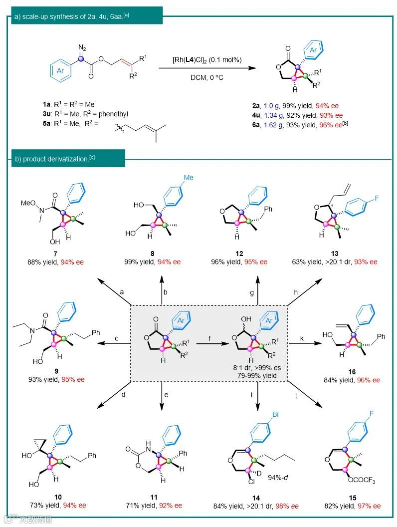 在该工作中,徐明华教授团队利用其课题组发展的低配位态的一价铑/手性双烯催化体系,成功实现了颇具挑战的多取代α-芳基重氮烯丙酯的分子内不对称环丙烷化反应,该方法可以在非常温和的条件下实现,并且在0.1 mol%的催化剂存在下,高效、快速构建一系列含有三个连续立体中心(包括两个季碳手性中心)的双环/五取代环丙烷类化合物;产物通过官能团的多样性转化可以实现各种高光学纯度的五取代环丙烷化合物的合成。