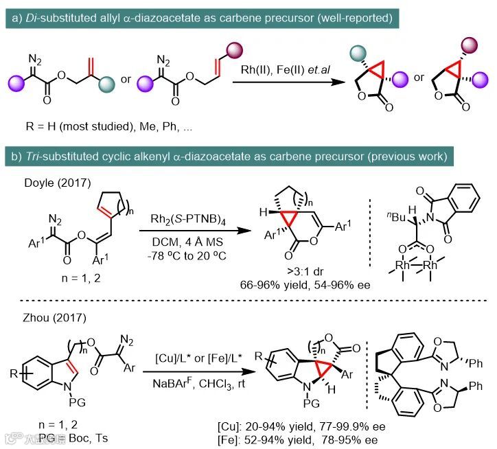 环丙烷由于其独特的空间结构以及反应性,在合成化学及药物设计中受到广泛关注,此外,多取代的环丙烷结构存在于很多天然产物、药物分子以及生物活性分子当中,因此发展高效的合成方法用于各种取代的手性环丙烷的构建一直是化学家们最感兴趣的课题之一,其中,高取代手性环丙烷的构建仍是难点。近年来,化学家们相继发展了Rh(II)、Ru(II)、Co(II)、Cu(I/II)、Fe(II)等手性配合物催化的基于金属卡宾转移的烯烃环丙烷化反应构建手性环丙烷的方法,在不对称环丙烷化反应研究中取得了重要进展;然而,要同时控制环丙烷三个相邻碳立体中心实现高取代(五或六取代)环丙烷的催化不对称合成仍非常具有挑战性。其中,基于卡宾转移的分子内环丙烷化反应是合成高取代三元环最有效的方法之一,目前,针对多取代的α-重氮烯丙酯的不对称分子内环丙烷化反应的文献报道虽然较多,但方法普遍局限于构建二、三以及四取代手性环丙烷(图1),五取代手性环丙烷的催化不对称合成则仅有极少数几例报道,其中最为成功的是Doyle和周其林/朱守非教授团队通过设计独特的三取代环烯烃α-重氮乙酸酯作为卡宾前体的分子内环丙烷化,可以获得含五取代环丙烷结构的多并环手性化合物。