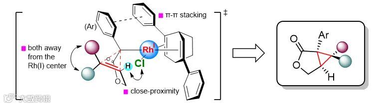 与刚性八面体铑(II)配合物相比,低配位铑(I)配合物采用平面四方形结构,上下两个轴向位无配位。在多取代的α-芳基重氮烯丙酯参与的不对称分子内环丙烷化反应中,作者设想,这样铑(I)配合物中配体与α-取代基之间以及重氮底物的烯烃取代基之间的空间位阻可能较小,也许有利于环丙烷化反应中的过渡态;而手性烯烃配体双键上的两个相向的芳基取代基,可能可以帮助区分反应的立体选择性(图2)。