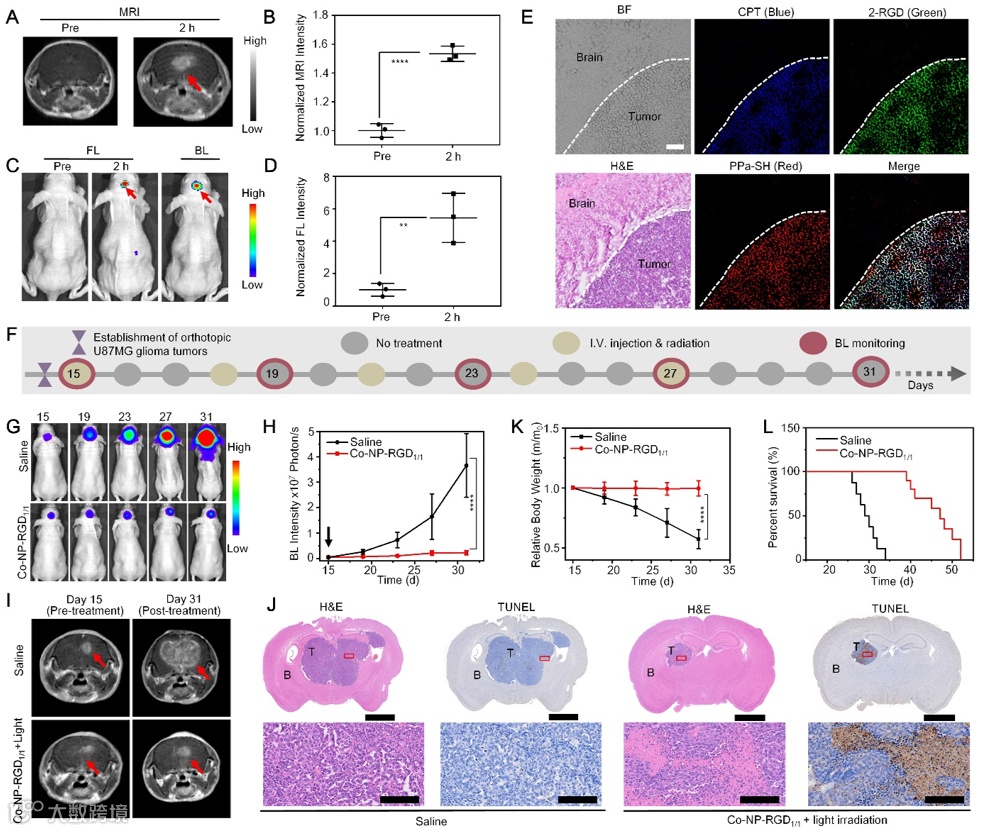 通过静脉给药后,Co-NP-RGD借助纳米颗粒大量的RGD靶向基团作用,能有效穿越BBB,并递送到原位脑胶质瘤细胞(U87MG和U251)中,一方面产生增强的核磁共振成像造影信号用于定位处于脑部的原位脑胶质瘤;另一方面,在脑胶质瘤细胞内高浓度的谷胱甘肽作用下,发生快速的解组装,同时释放出小分子抗肿瘤药物CPT和近红外光敏剂PPa,从而恢复光动力学功能,并产生增强的近红外荧光信号用于监测药物的释放和蓄积。在双模态成像信号的指导下,用低剂量的690 nm激光(0.2 W/cm2)照射小鼠的原位脑胶质瘤,产生化疗-光动力治疗协同治疗,能有效延缓了原位脑胶质瘤的生长,并延长了小鼠的生存期(图3)。