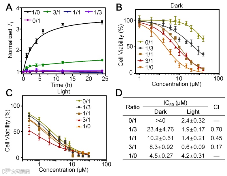 图2. 优化PPa-RGD和CPT-RGD的共组装比列用于制备兼具良好稳定性和协同治疗效果的纳米探针