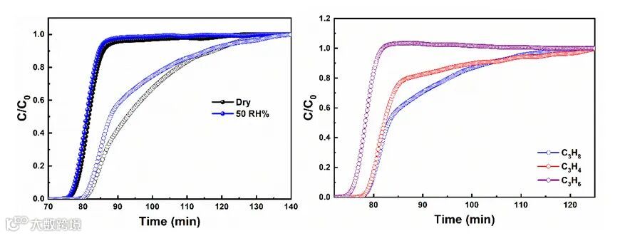 图4. 湿度条件下的丙烯、丙烷穿透曲线(左图),丙烯、丙烷、丙炔三组分穿透曲线(右图)。