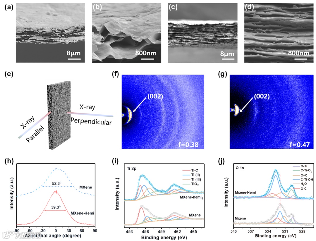 通过电镜和广角XRD表征发现,半纤维素引入后,大幅度减小了MXene复合膜中的结构缺陷。在微观尺度上增加了MXene的结构取向。XPS分析表明,半纤维素极性基团与MXene表面的功能基团存在氢键相互作用,从而大大增强了MXene片层间界面作用力。