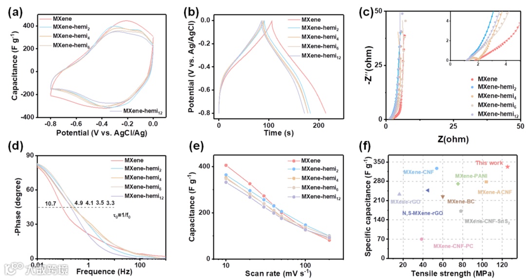 图4. MXene-半纤维素复合膜作为自支撑电极在超级电容器中的应用.