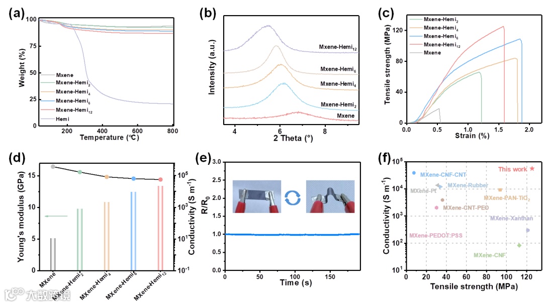 图 3. MXene-半纤维素复合膜机械性能和导电性表征.