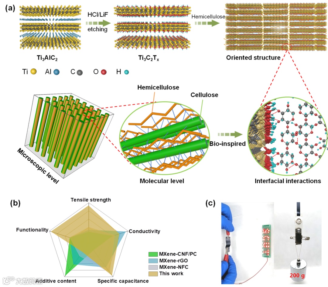 基于木材结构的特征,研究团队以小分子半纤维素作为MXene的分子粘合剂。这种设计方法,使得复合膜在微观尺度上具有增强的取向结构,在分子水平上具有增加的界面相互作用力,从而实现高导电和优异机械性能。并对复合膜作为结构电极在超级电容器和湿度传感器中的应用进行了探究。本文为MXene复合材料的结构设计和应用提供了新的和高效的替代方案。