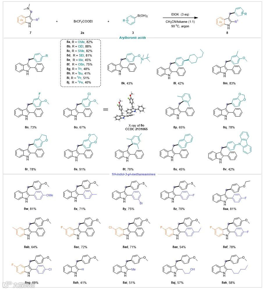 图4. 无过渡金属参与的3-二甲胺基吲哚与芳香/烯基硼酸在二氟卡宾促进下的偶联反应