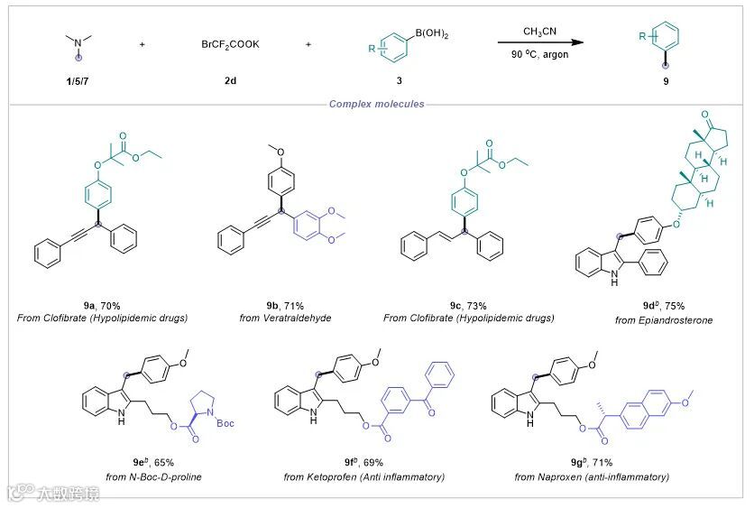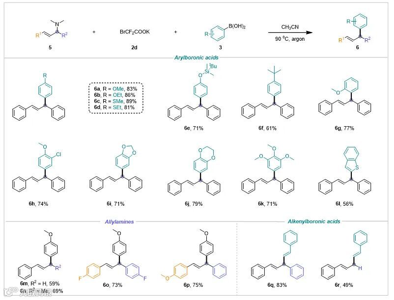 图3. 无过渡金属参与的烯丙基胺与芳香/烯基硼酸在二氟卡宾促进下的偶联反应